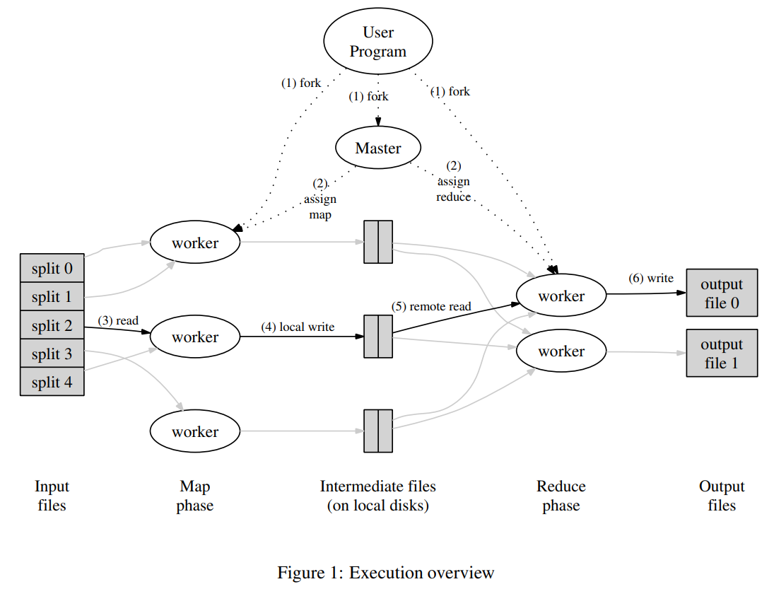 图1展示了我们实现的 MapReduce 的整体流程。当用户程序调用 MapReduce 函数时,会按顺序发生以下列出的操作。