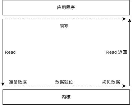 在 BIO 模型中,应用程序发起 Read 调用后,会一直阻塞,直到内核包数据拷贝到用户空间。