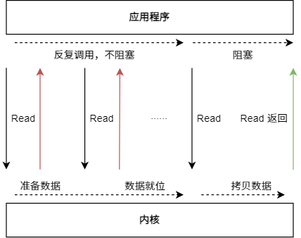 在这个同步 NIO 模型中,应用程序会一直发起 Read 调用,反复调用的过程不阻塞,但等待数据从内核空间拷贝到用户空间的这段时间里,线程依然是阻塞的。