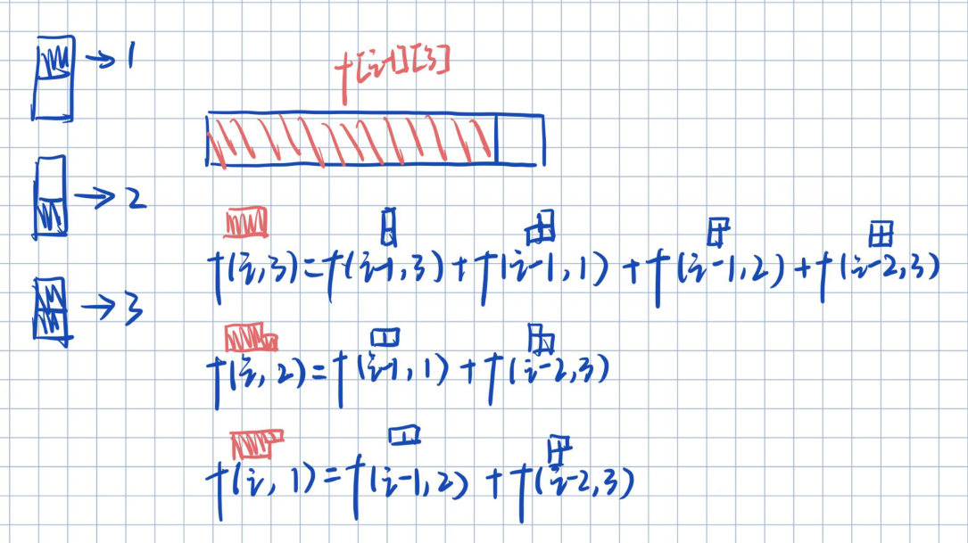 f[i][3] = f[i-1][3] % MOD + f[i-1][1] % MOD + f[i-1][2] % MOD + f[i-2][3] % MOD;