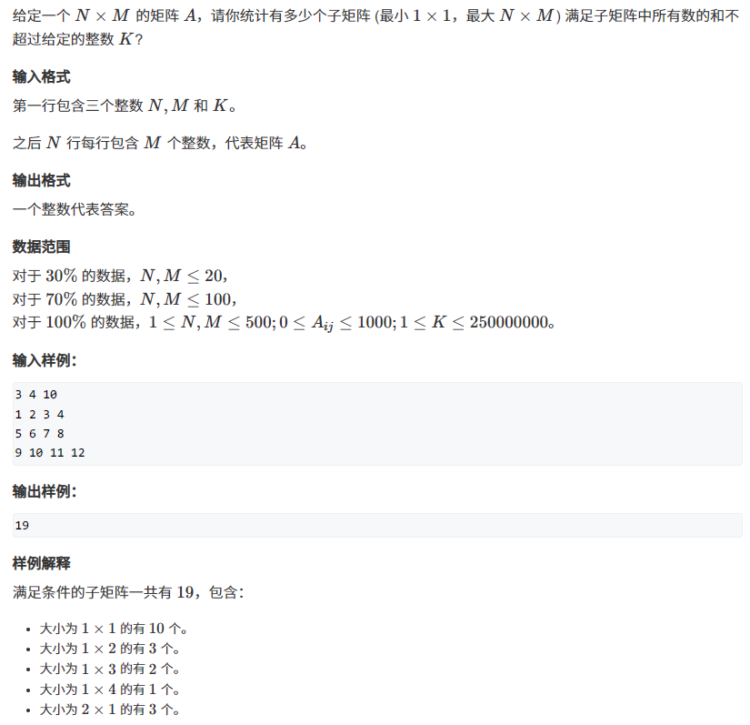 用两个变量枚举上边界和下边界,然后用双指针枚举两个端点L和R。如果个时刻,L到R之间的矩阵满足 的条件,则在该区间内一定有个子矩阵满足条件。