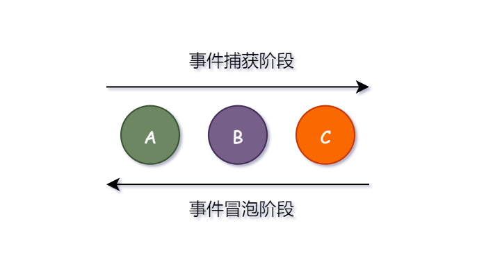 事件会从子组件冒泡到父组件。如图,当最里边的元素 C 被点击时,事件会从最里边的元素开始向父元素传播。(父元素 A -> B -> C 子元素)。如果给它们分别绑定上点击事件的话(点击事件是打印自己的字母),控制台会按顺序打印 C B A。